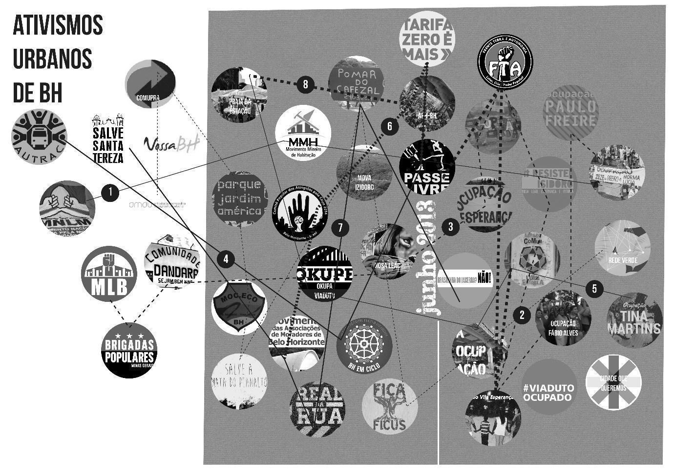Em Belo Horizonte foi relatada pelos entrevistados uma relação dinâmica de trocas entre os grupos. Essas articulações são consideradas fundamentais à resistência dos ativismos devido à fragmentação desses atores coletivos e a sua concentração em temáticas isoladas e em abordagens locais. Elas servem, então, tanto à ampliação das pautas dos grupos - para além das demandas e ações locais - como à ampliação de sua pressão política, sobretudo, em relação aos outros agentes na produção do espaço urbano - como o Estado e a iniciativa privada.