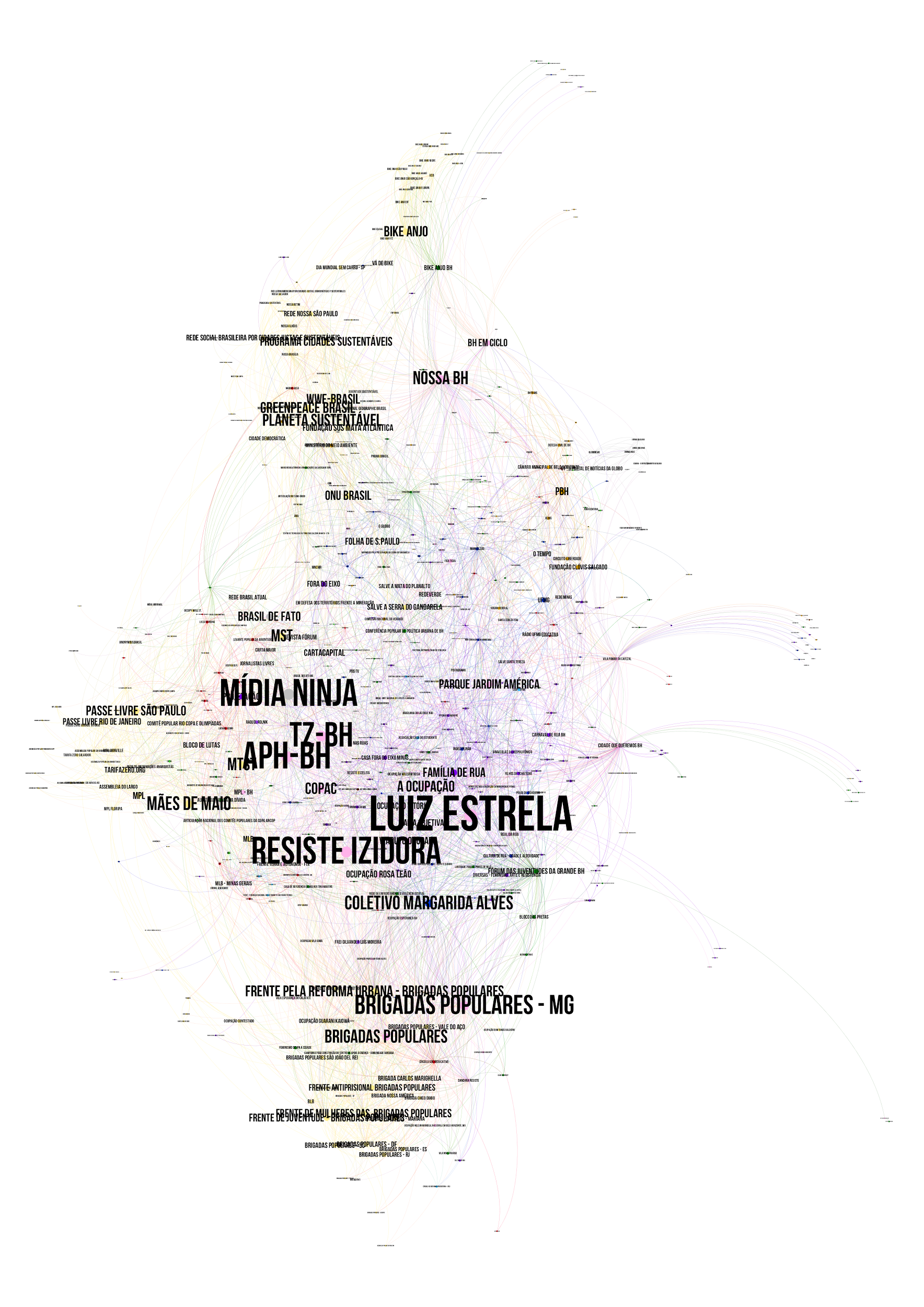 Em seguida, também pelo Netvizz foram colhidas informações sobre curtidas em um universo expandido de fanpages. Denominada rede de grau 2, são consideradas, além das curtidas entre os ativismos urbanos delimitados para a pesquisa, todas as fanpages por eles curtidas e as interações dessas com as demais. As seguintes cores foram utilizadas na diferenciação entre os agentes que passam a compor o grafo: ativismos urbanos em sentido forte em rosa, movimentos ligados à arte e à cultura em roxo, canais de mídia tradicional e alternativa em cinza, ativismos de outros locais ou de escalas mais abrangentes em amarelo, movimentos estudantis em azul claro, grupos religiosos em marrom, instituições e órgãos públicos em laranja, ativismos atuantes em Belo Horizonte com enfoque distinto do espaço urbano em verde, grupos de pesquisa e extensão universitária, instituições universitárias ou grupos de assessoria técnica em azul escuro, partidos políticos e figuras políticas em vermelho e sindicatos e associações profissionais em marrom claro.