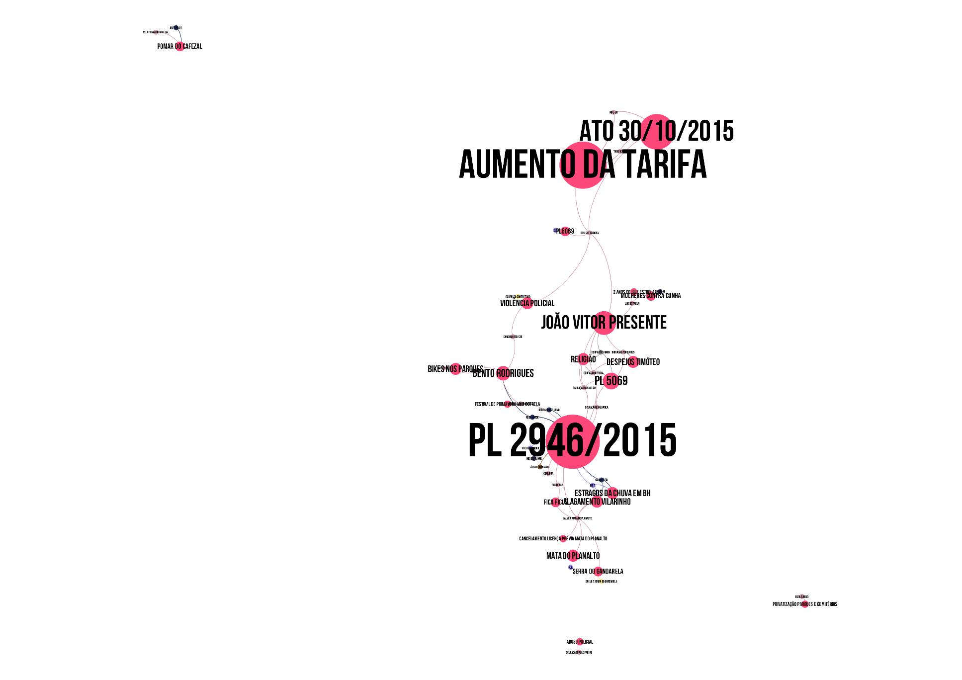 Em setembro de 2015 a Segunda Ocupação da Câmara Municipal, promovida por ativismos ligados à questão do transporte, conseguiu mobilizar grupos ligados à diferentes temáticas, como vemos na Figura 4. A ação tinha como pauta principal a realização de uma Audiência Pública para discutir os aumentos ilegais da tarifa do ônibus ocorridos naquele mesmo mês. Por outro lado, assuntos de menos expressividade ficaram contidos a grupos de mesma temática, como é possível observar no caso das ocupações urbanas para fins de moradia à esquerda, mobilizadas em torno de temáticas como os despejos das ocupações urbanas Canaã (em Contagem) e Macuco, Recanto Verde e Limoeiro (em Timóteo).